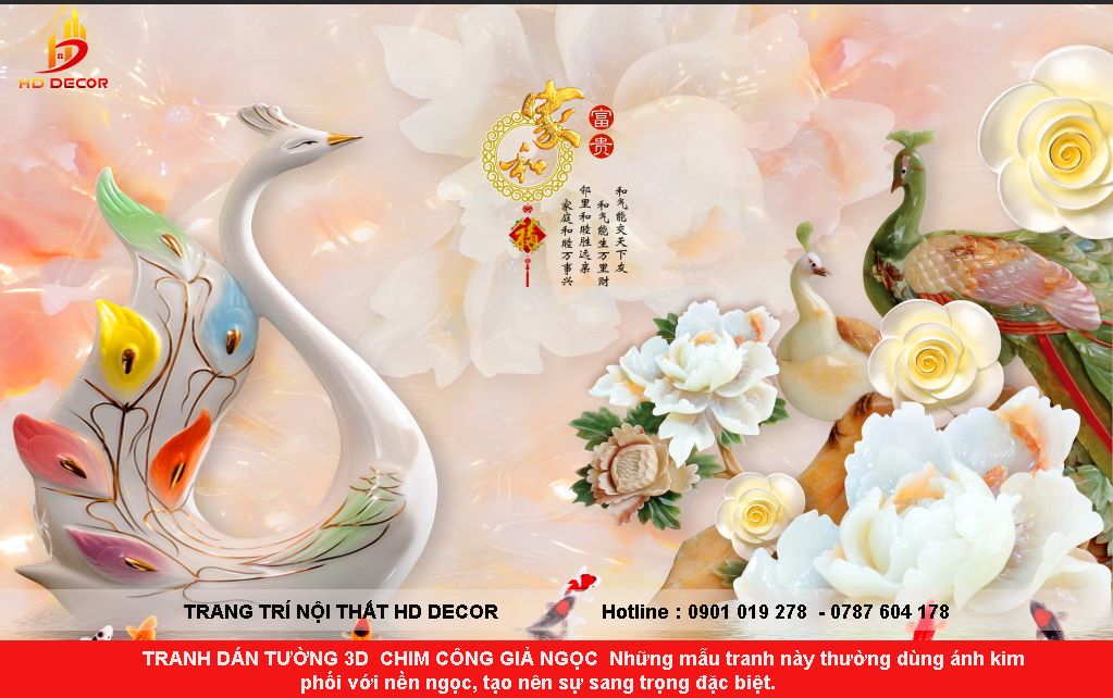 Tranh 3D giả ngọc là loại tranh dán tường trang trí được in theo hình vẽ , hoạ tiết ngọc lên đó . Các họa tiết , các vân nổi lên , cùng màu sắc và độ phản quang mạnh tạo cảm giác như thật . Đó là nhờ sự tài tình của các họa sĩ cũng như thiết kế để tạo nên một bức tranh dán tường 3D giả ngọc sống động y như thật , cách thức sử dụng rất đơn giản là bôi keo lên tường và dán lên tường cùng lớp keo siêu dính mà ai cũng có thể làm được.