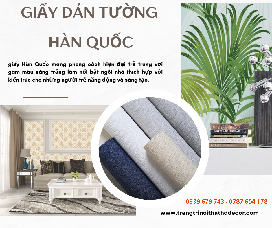 Giấy dán tường Hàn quốc cũng là loại giấy dán tường được nhiều người tiêu dùng yêu thích. Giấy dán tường Hàn quốc với mẫu mã trẻ trung, hiện đại bắt kịp nhiều xu hướng nội thất mang đến cho căn nhà bạn những màu sắc độc đáo. gồm các lớp cấu tạo chống thấm nước, chống xước và có khả năng giữ nhiệt cho căn nhà, khả năng chống ồn tuyệt vời. Các loại chất liệu làm giấy dán tường chất lượng là chất liệu nhựa PVC chống thấm, chất liệu giấy Hàn quốc và Đài loan, Nhật bản bền dai với các mẫu mã trẻ trung và độc đáo được thiết kế với hàng trăm hình thù khác nhau. Các chất liệu làm giấy đều chống thấm nước, cách nhiệt, một số loại giấy còn giúp cách âm nhẹ; với độ dám dính tốt, không có khả năng tự lột hoặc tự bong ra trong quá trình sử dụng. Với các chất liệu tốt, giấy dán tường Hàn quốc có tuổi thọ tầm 10 năm và cam kết bảo vệ bức tường của căn nhà bạn dưới mọi điều kiện thời tiết.