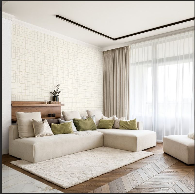 Ví dụ: Nếu phòng khách có tông trắng, bạn có thể tạo điểm nhấn với giấy dán tường xanh navy, vàng ánh kim hoặc họa tiết vân gỗ.