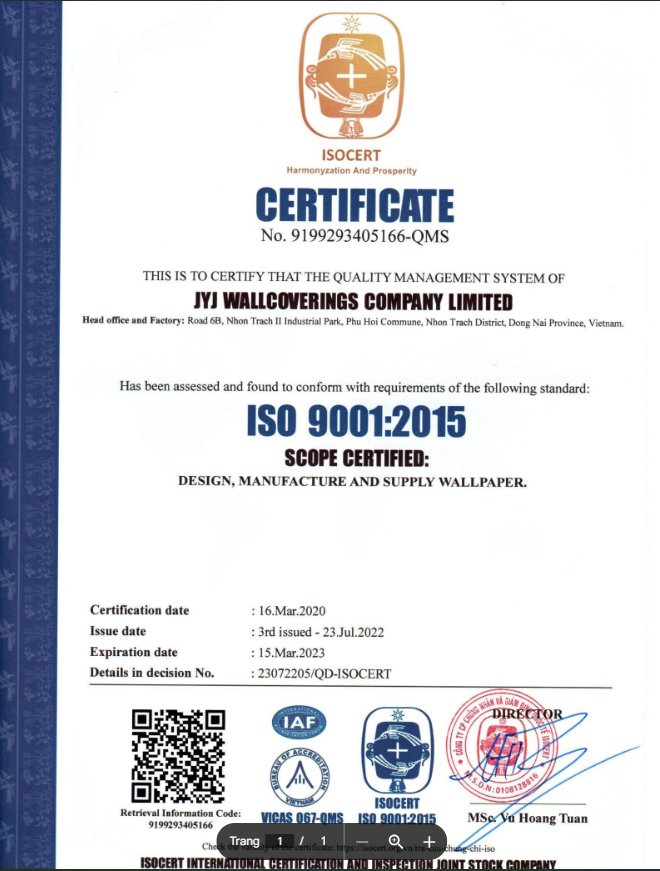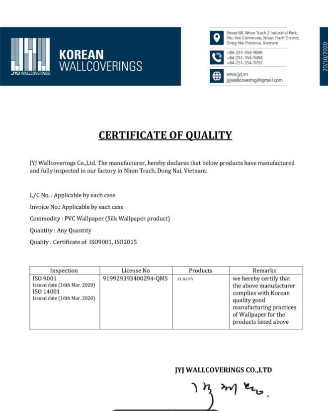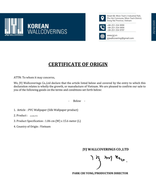 - GIẤY CHỨNG NHẬN GIẤY DÁN TƯỜNG HÀN QUỐC CHÍNH HÃNG :