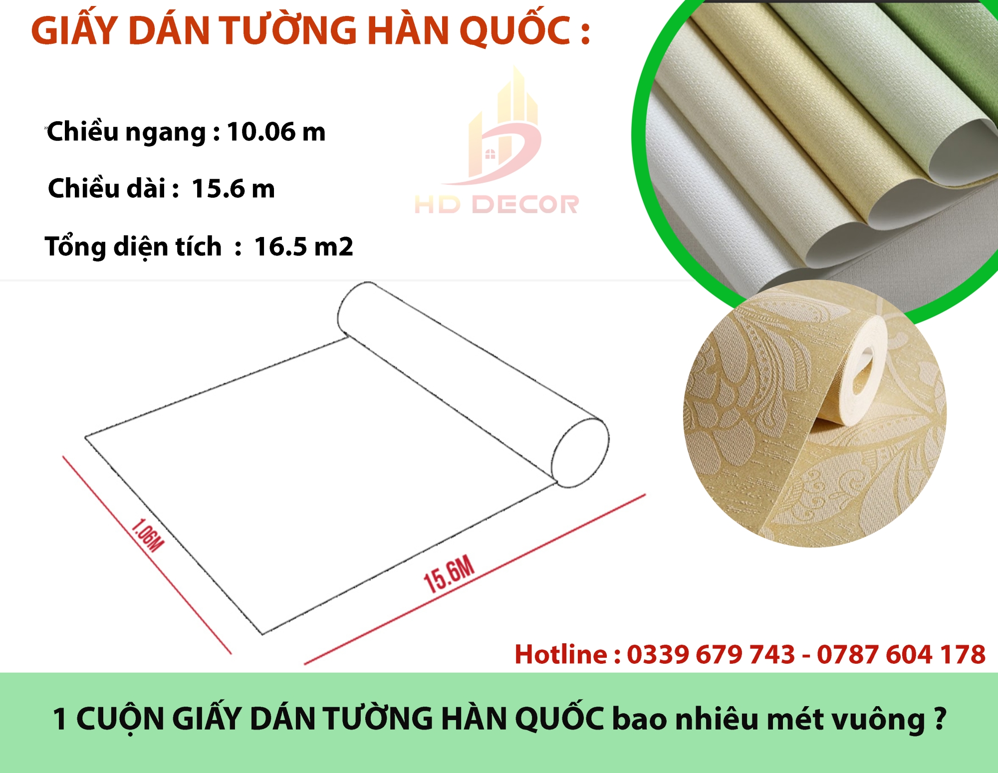 Thông thường giấy dán tường Hàn Quốc có 3 loại kích thước như sau: