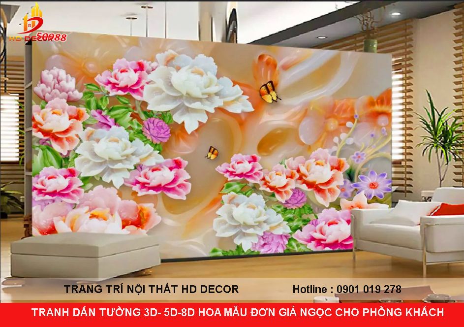 MẪU TRANH DÁN TƯỜNG 3D-5D-8D HOA MẪU ĐƠN GIẢ NGỌC CHO PHÒNG KHÁCH