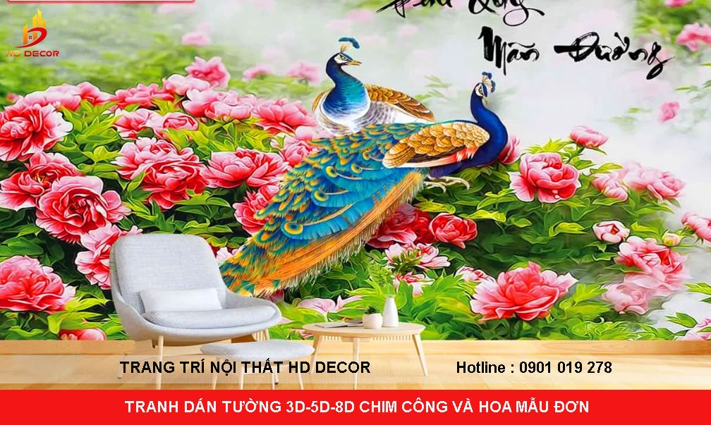 TRANH DÁN TƯỜNG 3D-5D-8D CHIM HẠC VÀ HOA MẪU ĐƠN