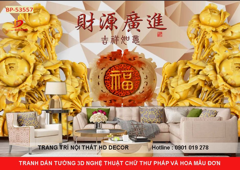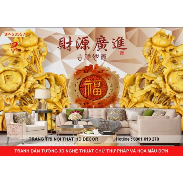 TRANH DÁN TƯỜNG 3D- 5D - 8D GIẢ NGỌC CHỮ THƯ PHÁP VÀ HOA SEN