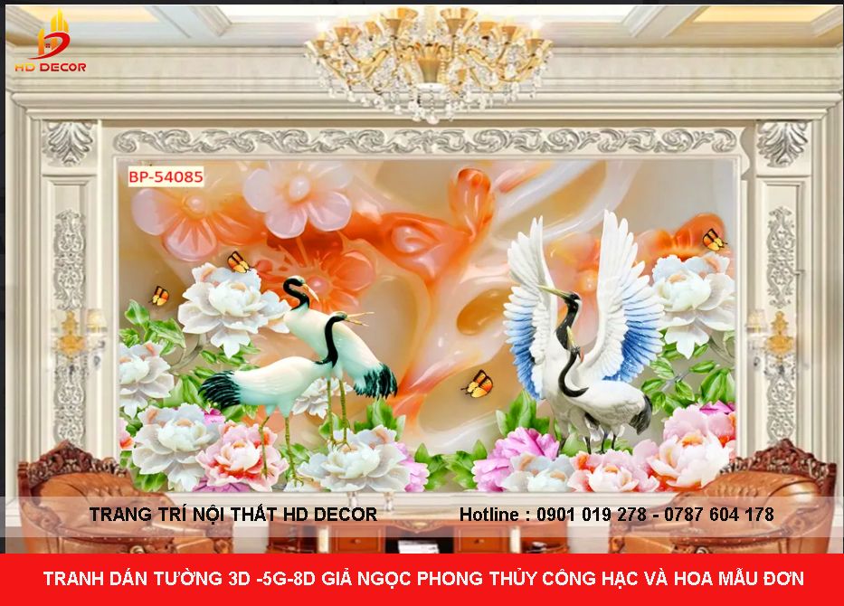 TRANH DÁN TƯỜNG 3D-5D-8D GIẢ NGỌC CÔNG HẠC VÀ HOA MẪU ĐƠN