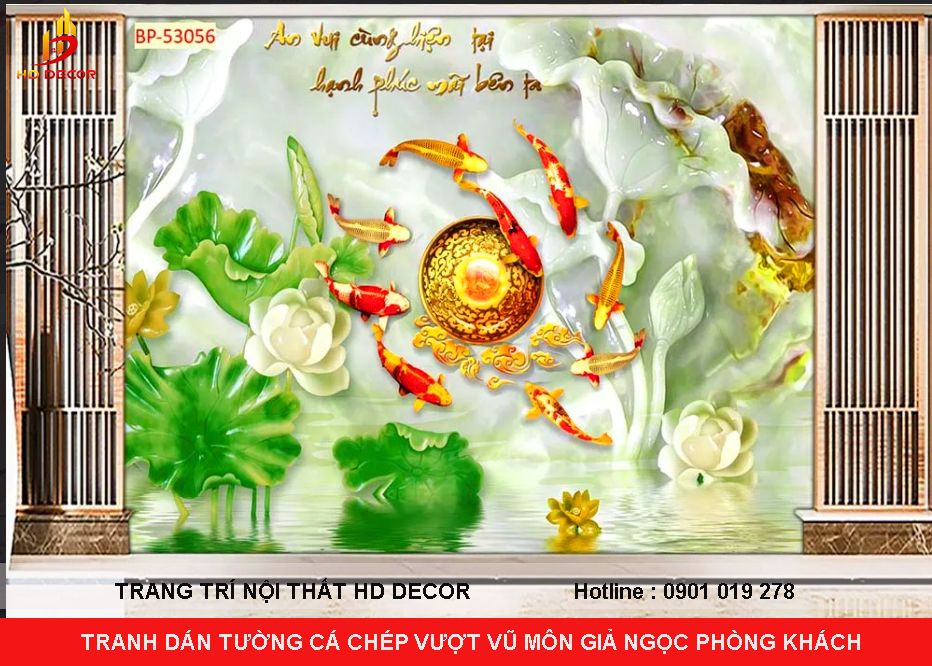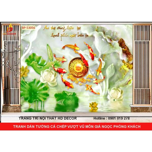 TRANH DÁN TƯỜNG 3D CÁ CHÉP VƯỢT VŨ MÔN GIẢ NGỌC CHO PHÒNG KHÁCH