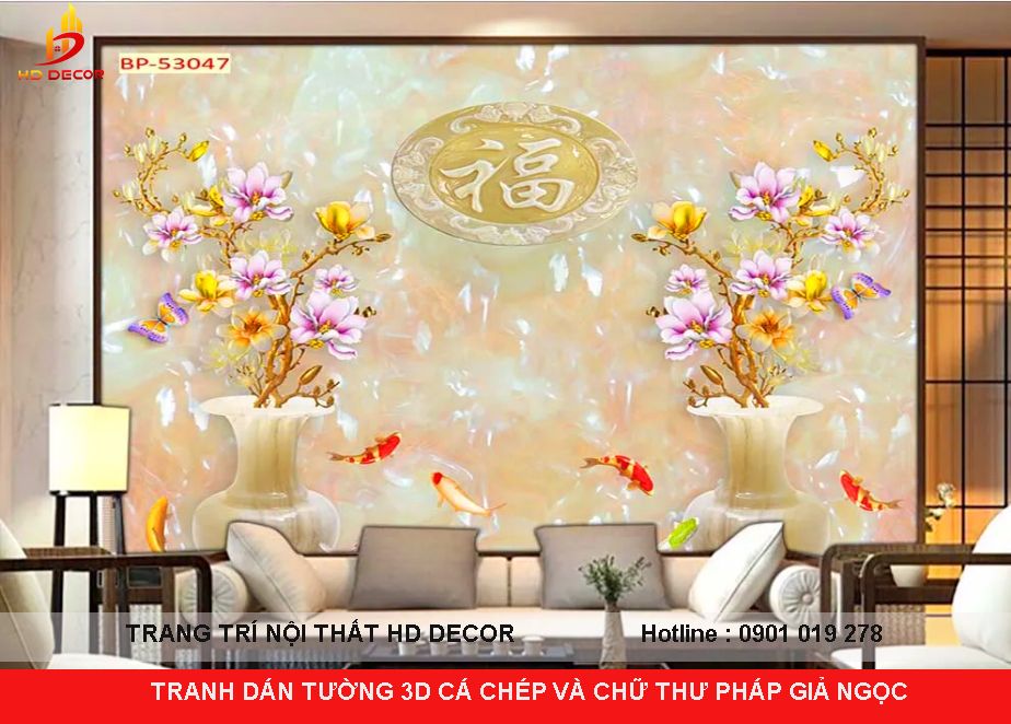 TRANH DÁN TƯỜNG 3D GIẢ NGỌC CÁ CHÉP VÀ CHỮ THƯ PHÁP