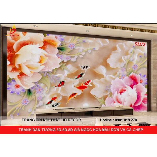 TRANH DÁN TƯỜNG 3D GIẢ NGỌC CÁ CHÉP VÀ HOA MẪU ĐƠN
