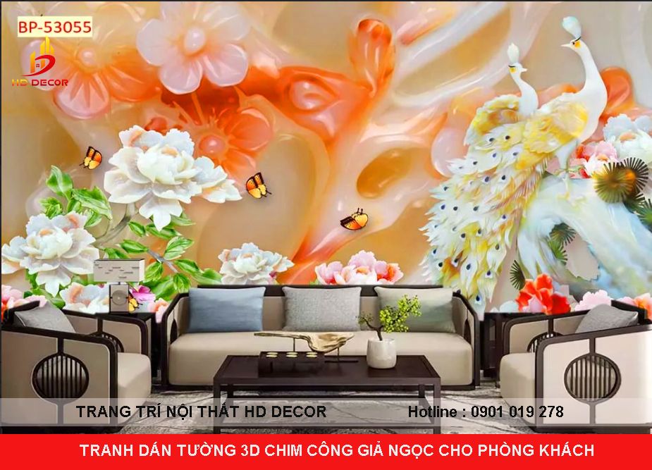 TRANH DÁN TƯỜNG 3D GIẢ NGỌC CHIM CÔNG CHO PHÒNG KHÁCH
