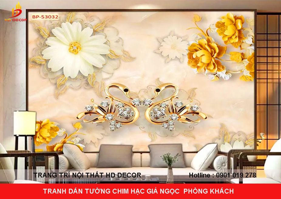 TRANH DÁN TƯỜNG 3D GIẢ NGỌC CHIM HẠC PHÒNG KHÁCH