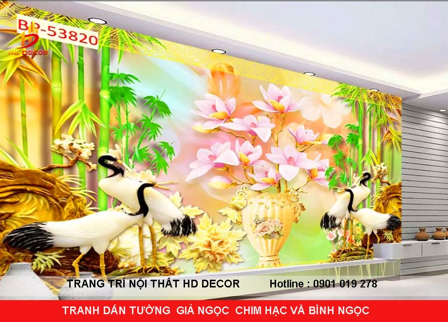 TRANH DÁN TƯỜNG 3D GIẢ NGỌC CHIM HẠC VÀ BÌNH NGỌC
