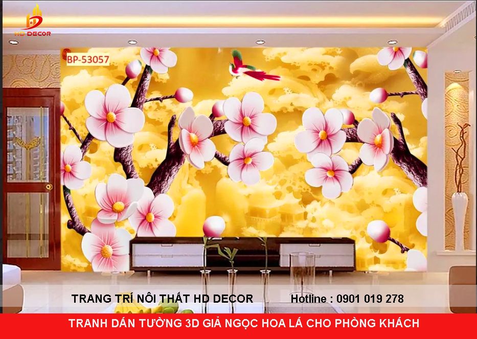 TRANH DÁN TƯỜNG 3D GIẢ NGỌC HOA ĐÀO CHO PHÒNG KHÁCH