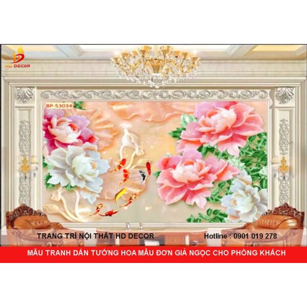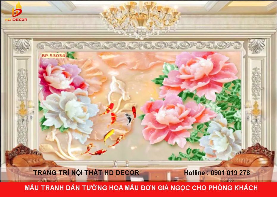 TRANH DÁN TƯỜNG 3D GIẢ NGỌC HOA MẪU ĐƠN CHO PHÒNG KHÁCH