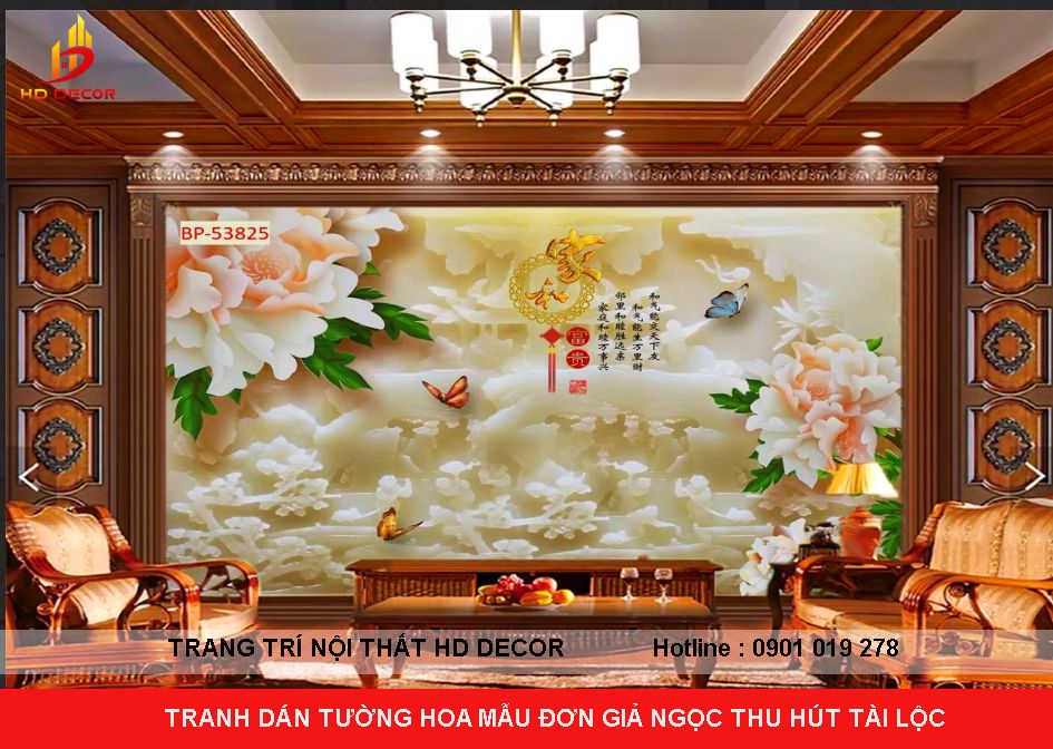 TRANH DÁN TƯỜNG 3D GIẢ NGỌC HOA MẪU ĐƠN THU HÚT TÀI LỘC