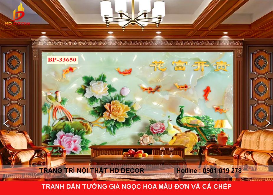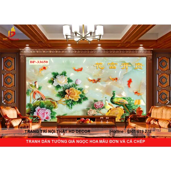 TRANH DÁN TƯỜNG 3D GIẢ NGỌC HOA MẪU ĐƠN VÀ CÁ CHÉP