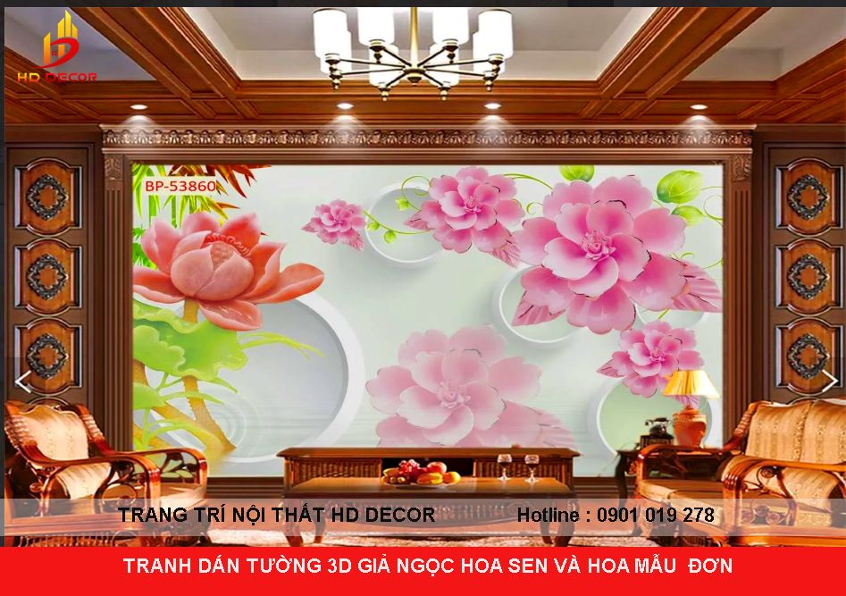 TRANH DÁN TƯỜNG 3D GIẢ NGỌC HOA SEN VÀ HOA MẪU ĐƠN