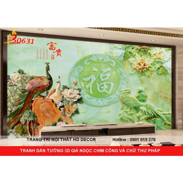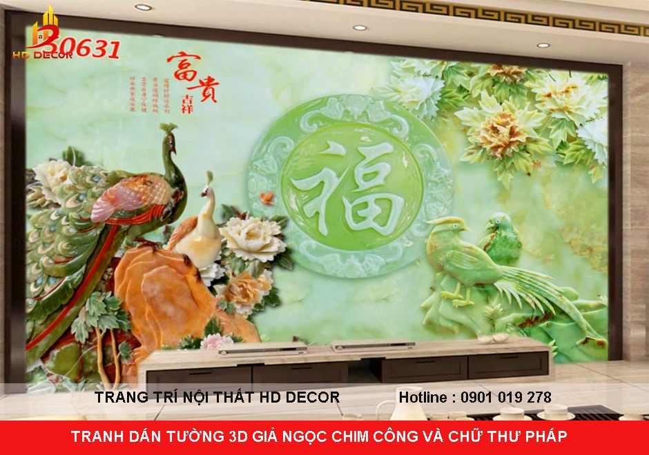 TRANH DÁN TƯỜNG 3D GIẢ NGỌC - TRANH DÁN TƯỜNG CHIM CÔNG VÀ CHỮ THƯ PHÁP