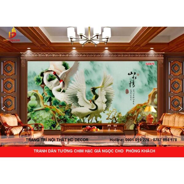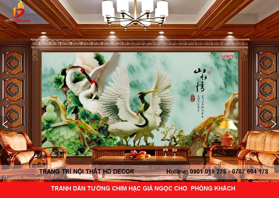 TRANH DÁN TƯỜNG 3D GIẢ NGỌC - TRANH DÁN TƯỜNG GIẢ NGỌC CHIM HẠC CHO PHÒNG KHÁCH