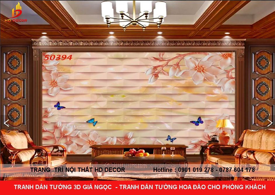 TRANH DÁN TƯỜNG 3D GIẢ NGỌC - TRANH DÁN TƯỜNG GIẢ NGỌC HOA ĐÀO CHO PHÒNG KHÁCH