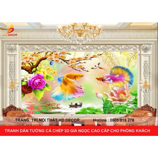TRANH DÁN TƯỜNG CÁ CHÉP 3D GIẢ NGỌC CAO CẤP CHO PHÒNG KHÁCH