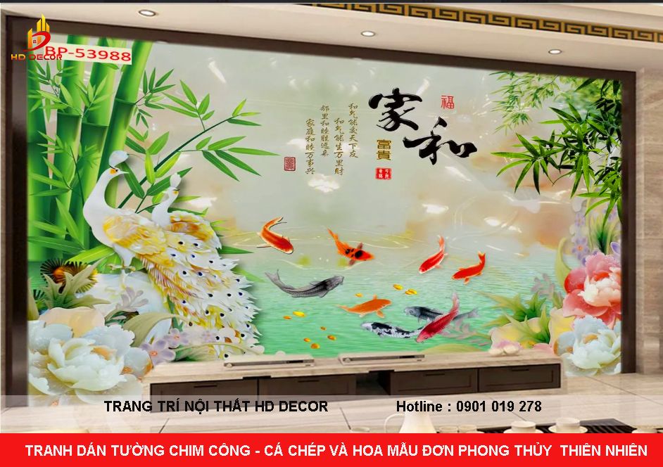 TRANH DÁN TƯỜNG CHIM CÔNG - CÁ CHÉP VÀ HOA MẪU ĐƠN PHONG THỦY THIÊN NHIÊN
