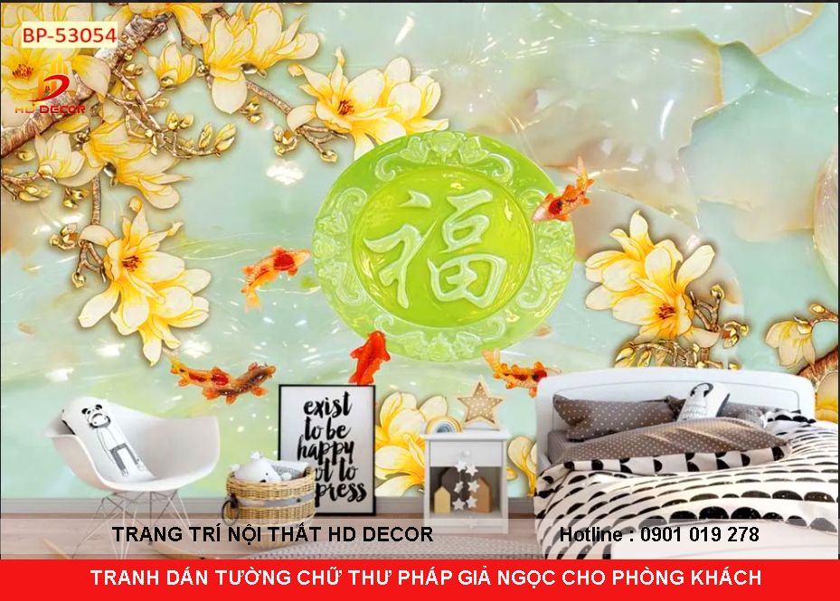 TRANH DÁN TƯỜNG CHỮ THƯ PHÁP GIẢ NGỌC CHO PHÒNG KHÁCH