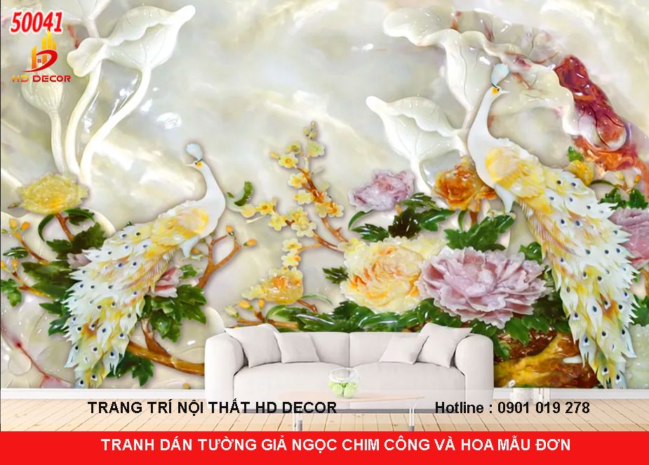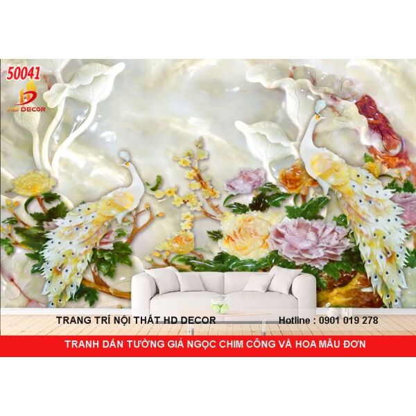TRANH DÁN TƯỜNG GIẢ NGỌC CHIM CÔNG VÀ HOA MẪU ĐƠN