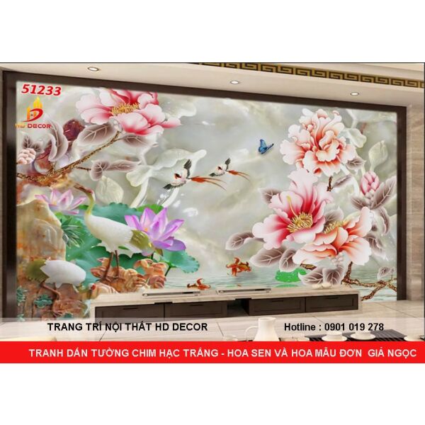 TRANH DÁN TƯỜNG GIẢ NGỌC CHIM HẠC TRẮNG - HOA SEN VÀ HOA MẨU ĐƠN