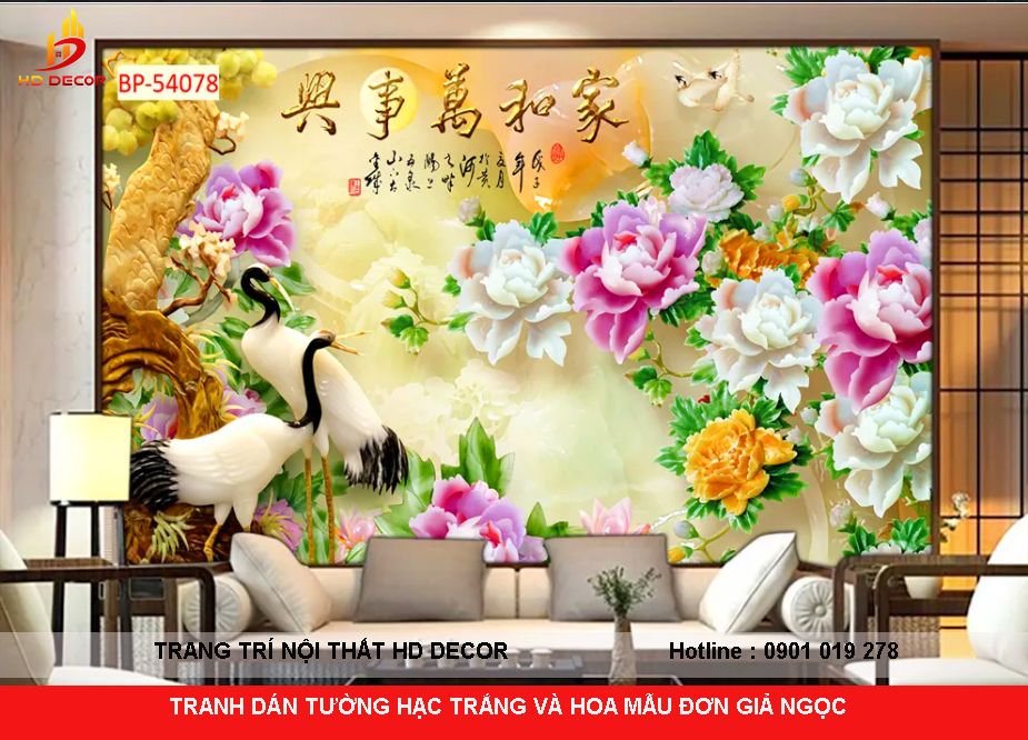 TRANH DÁN TƯỜNG GIẢ NGỌC HẠC TRẮNG VÀ HOA MẪU ĐƠN