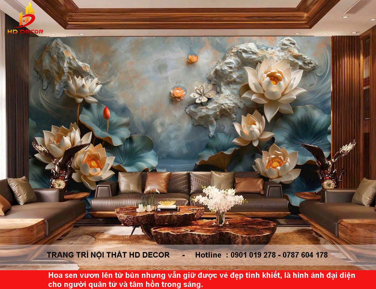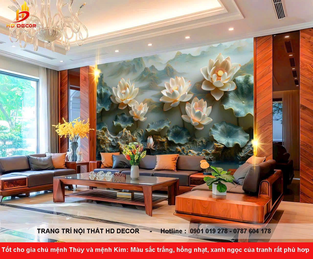 Tranh dán tường giả ngọc hoa sen là dòng tranh in 3D trên chất liệu PVC hoặc vải lụa cao cấp, bề mặt phủ lớp giả ngọc bóng mịn tạo chiều sâu và độ sang trọng. Hình ảnh hoa sen – biểu tượng của sự thanh tịnh, thuần khiết – kết hợp với hiệu ứng ngọc tạo nên tác phẩm nghệ thuật đầy giá trị thẩm mỹ và phong thủy.