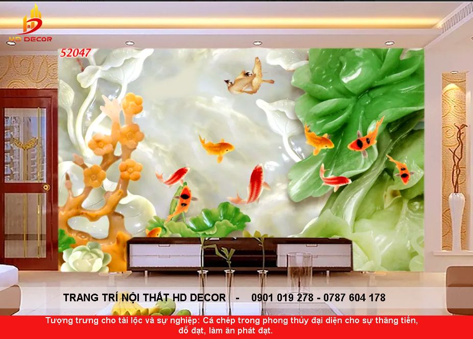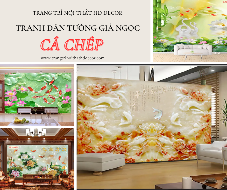 Tranh dán tường giả ngọc cá chép là dòng tranh trang trí được in 3D hoặc UV cao cấp trên chất liệu giả ngọc, tạo hiệu ứng sang trọng, bóng mịn như ngọc thật. Hình ảnh cá chép – linh vật phong thủy tượng trưng cho tài lộc và thành công – được thể hiện sống động, tinh tế, đặc biệt thích hợp để trang trí phòng khách.