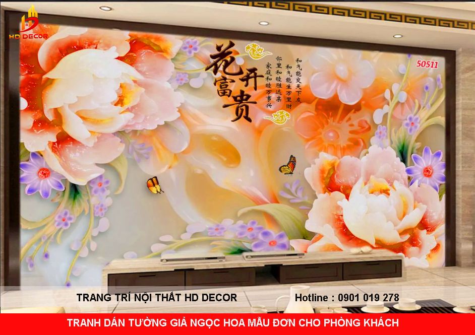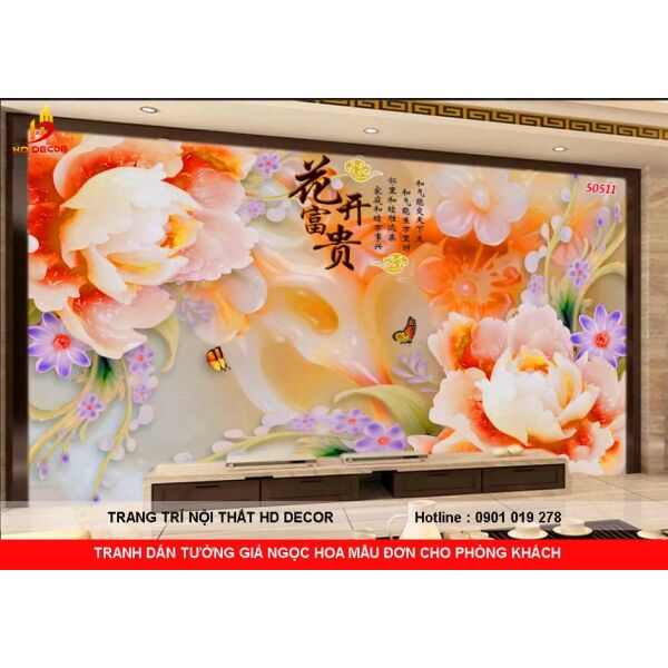 TRANH DÁN TƯỜNG GIẢ NGỌC - TRANH DÁN TƯỜNG GIẢ NGỌC HOA MẪU ĐƠN CHO PHÒNG KHÁCH