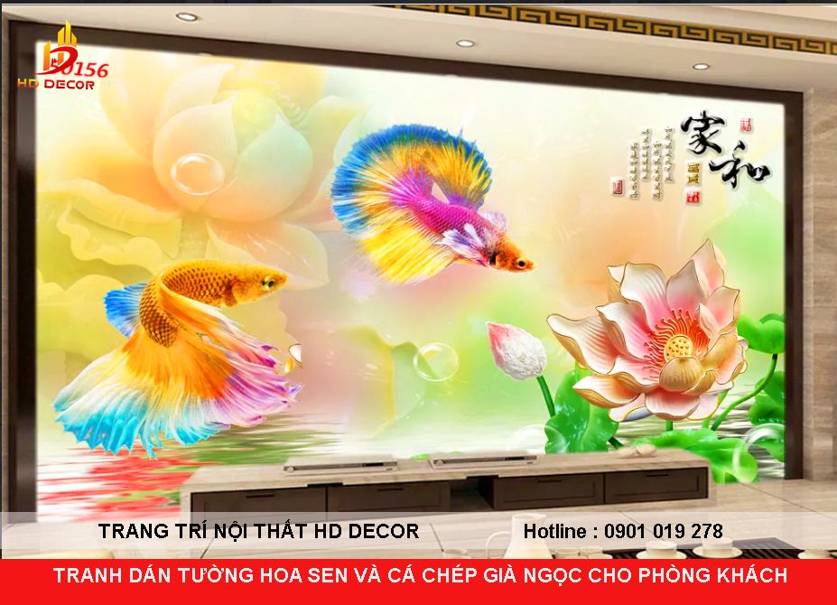 TRANH DÁN TƯỜNG HOA SEN VÀ CÁ CHÉP GIẢ NGỌC CHO PHÒNG KHÁCH