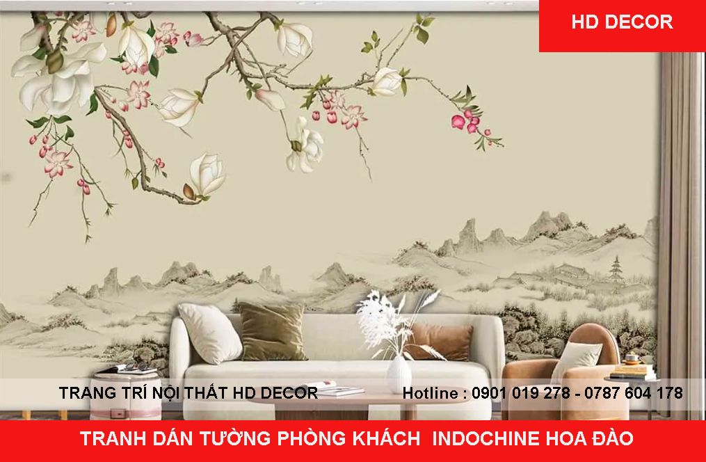 TRANH DÁN TƯỜNG PHÒNG KHÁCH INDOCHINE HOA ĐÀO
