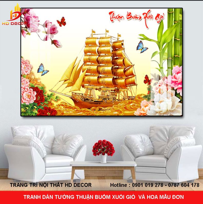 TRANH DÁN TƯỜNG THUẬN BUỒM XUÔI GIÓ VÀ HOA MẪU ĐƠN