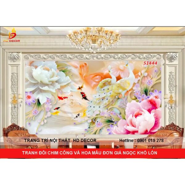 TRANH ĐÔI CHIM CÔNG VÀ HOA MẪU ĐƠN CHO PHÒNG KHÁCH KHỔ LỚN